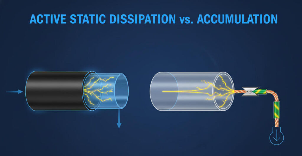 Standard silicone is an excellent electrical insulator. However, in dynamic applications—such as peristaltic pumping or powder transfer—friction generates static electricity (triboelectric charging). If trapped, this charge can arc, causing explosions in volatile environments, clogging inkjet nozzles, or frying sensitive circuit boards.