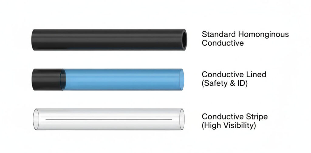 Standard conductive tubing relies on Carbon Black, forcing the entire tube to be opaque black. This creates two problems: you can’t see your fluid, and the exterior of the tube is electrically live. We solve this with advanced Multi-Layer Co-Extrusion.