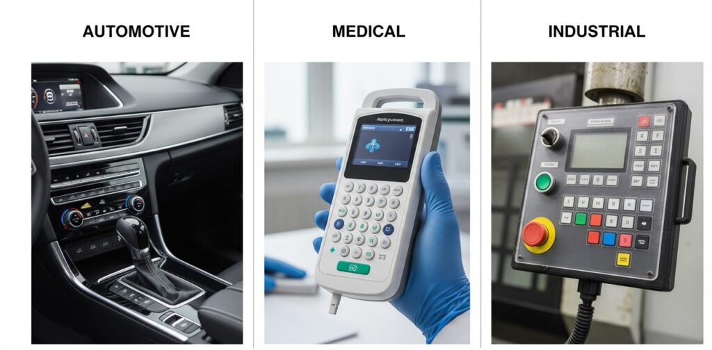 3. Industrial Controls Heavy-duty conductive button keypads with deep webbing for gloved operation and IP67 sealing.