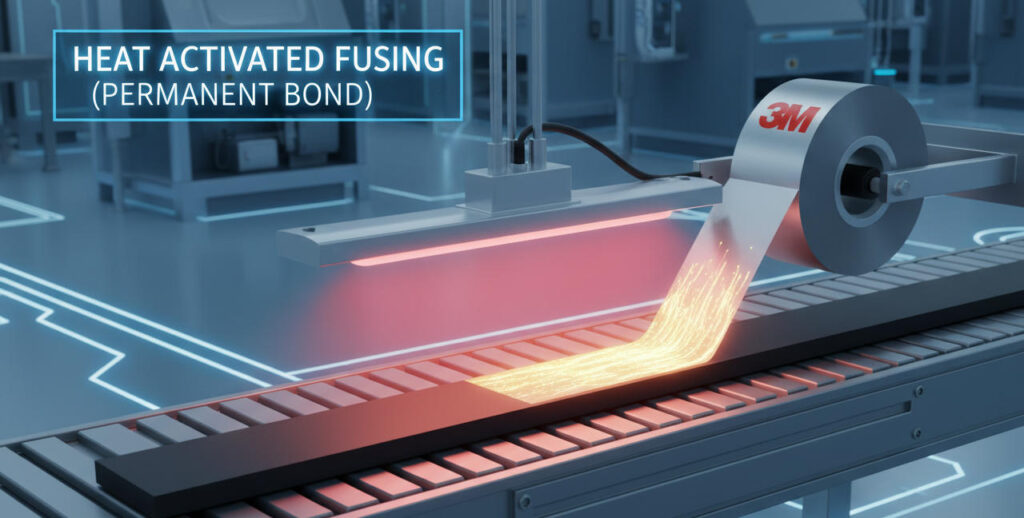 • Heat Fusion: We apply the adhesive system while the rubber is hot or re-heated. This heat creates a molecular bond between the tape’s acrylic adhesive and the rubber substrate.