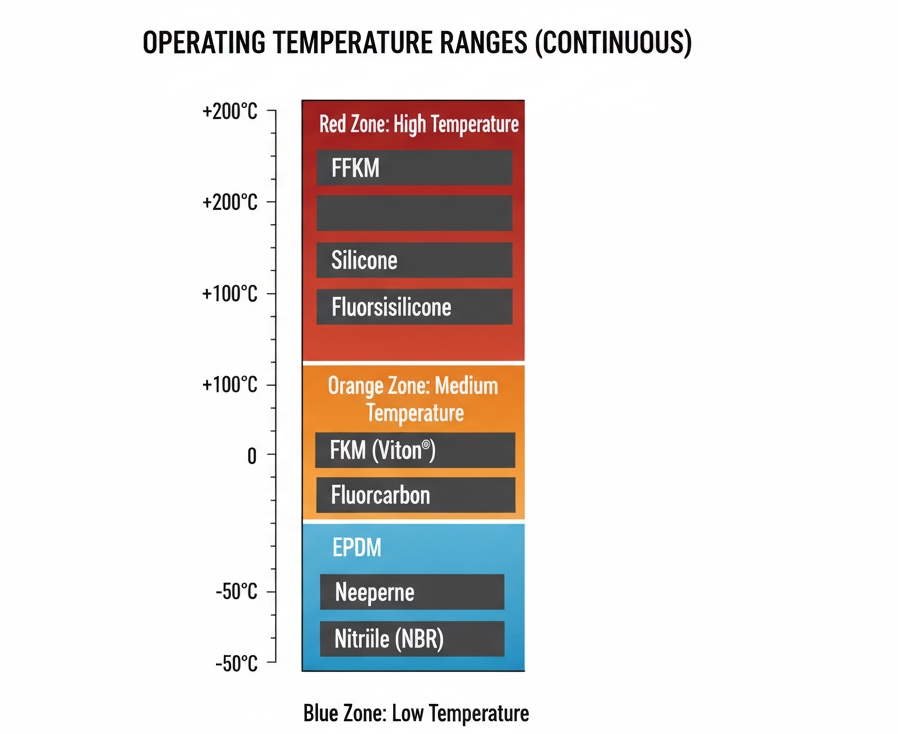 • Silicone (VMQ): Offers the widest operating temperature range ( to ). It is chemically inert, odorless, and retains flexibility in deep freezes.