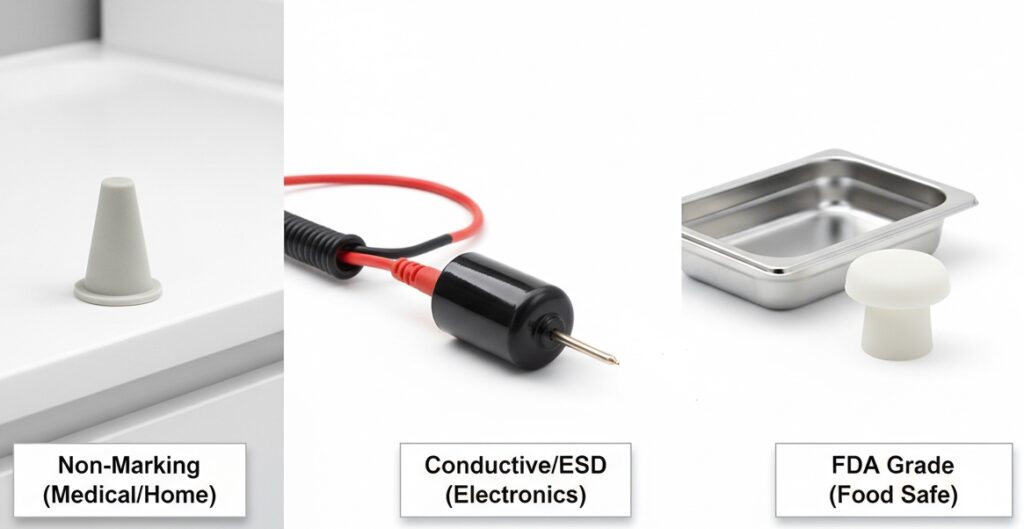 • The Capability: For commercial kitchen equipment (blenders, slicers), we offer FDA 21 CFR 177.2600 compliant White Nitrile bumpers that resist animal fats and cleaners without harboring bacteria.