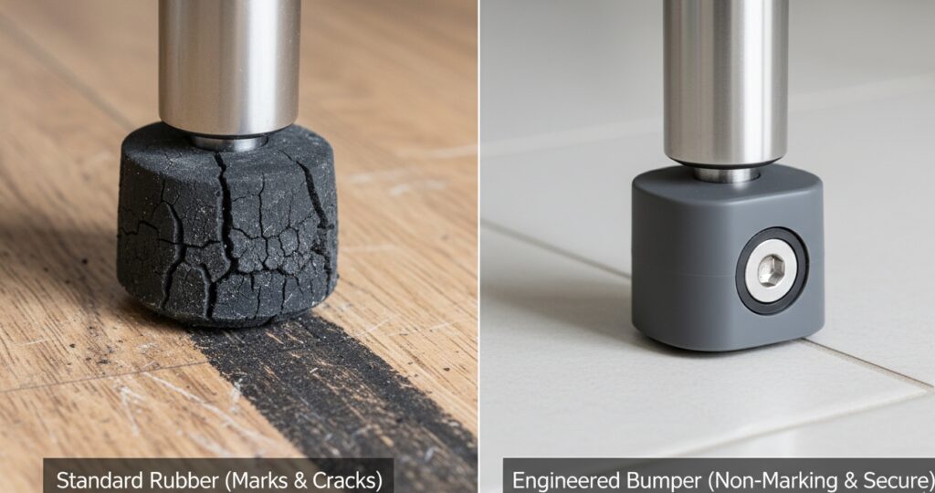 Most bumpers are made from cheap SBR rubber loaded with Carbon Black—the primary cause of scuff marks on floors. We offer specialized compound upgrades tailored to your operating environment.