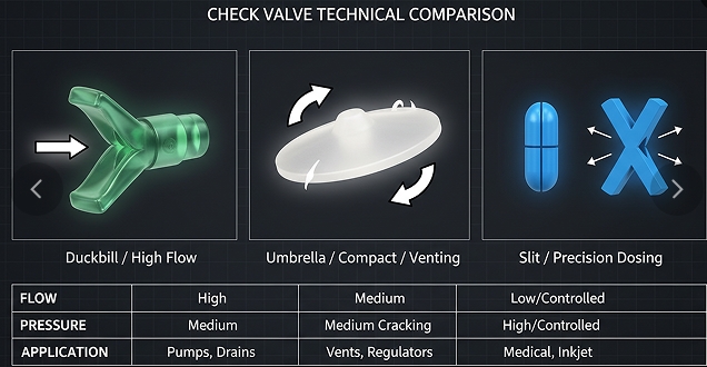 Q: How do I choose between a Duckbill and an Umbrella valve? A: It depends on your flow direction and space. Choose a silicone duckbill valve if you need axial flow (straight through) and high volume handling. Choose an umbrella check valve if you need a compact solution for pressure relief or venting where space is limited.