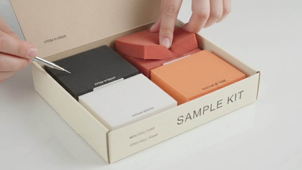 • Inside the Kit: Swatches of Open Cell vs. Closed Cell, Silicone Sponge, EPDM, and Rubberized Foam (Fabric Reinforced).